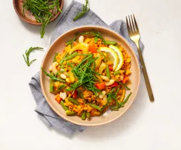 Schil intussen 200 g zoete aardappel en snij in blokjes van 1-2 cm. Spoel de 100 g rode linzen af met koud water. Voeg beide bij de sjalot en zet samen ca. 1 cm onder water. Voeg zout en evt. 1 laurierblad toe en breng aan de kook. Dek af en kook zachtjes op laag vuur in ca. 10 minuten gaar. Roer af en toe.