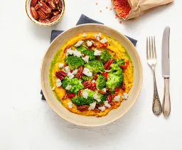 Serveer de broccoli en haloemie op de puree. Besprenkel royaal met olijfolie extra vierge.