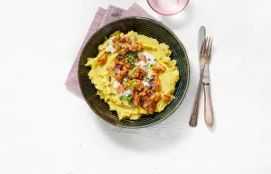 Giet de aardappelen en zoete aardappel af en bewaar wat kookvocht! Stamp tot puree en maak smeuïg met wat kookvocht en een scheut olijfolie extra vierge. Breng op smaak met zout en peper. Meng 1 tl Ras el Hanout specerijen door de stamp en serveer het kipköftegehakt en winterse de ‘tzatziki’ erbij.