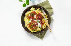 Giet aardappelen en zoete aardappel af en bewaar wat kookvocht! Stamp tot puree en maak smeuïg met wat kookvocht en een scheut olijfolie extra vierge. Roer de uien door de stamp en breng op smaak met zout en peper. Serveer met de burgertjes en winterse ‘tzatziki’.