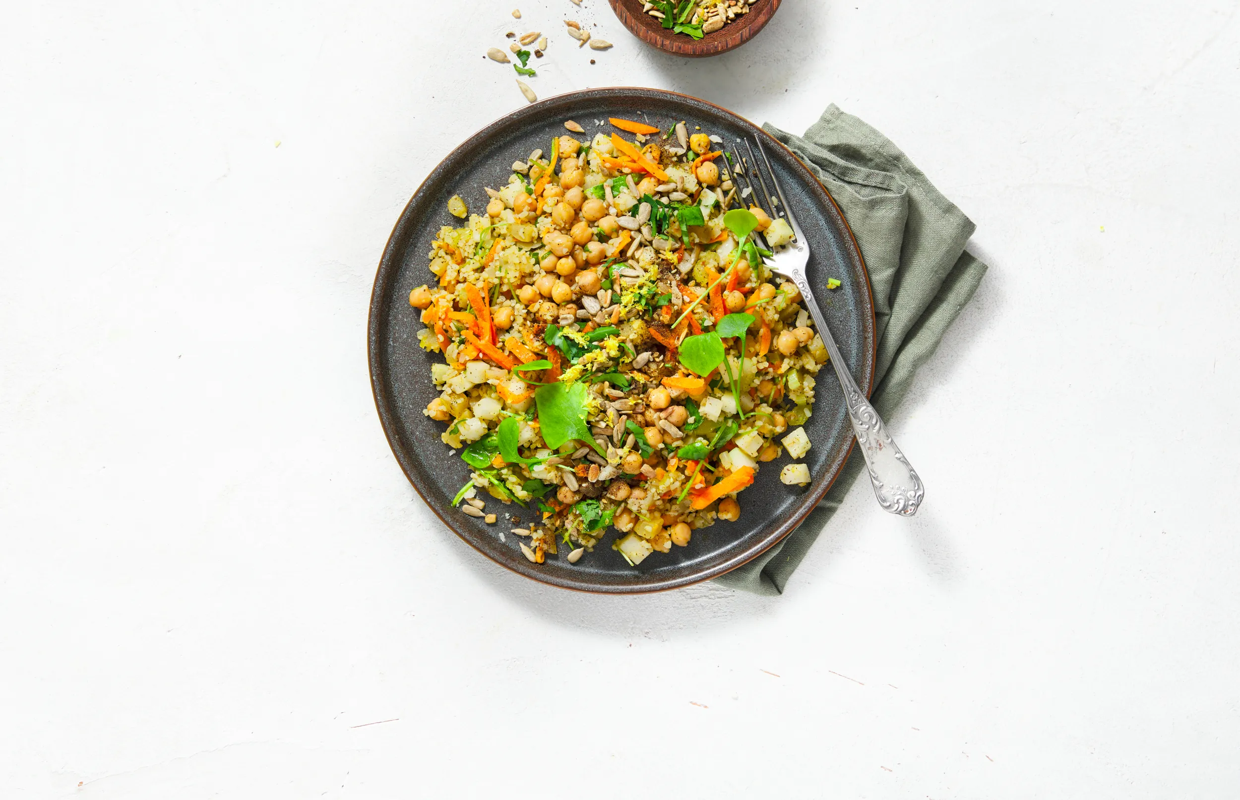 Maak de crunch. Bak 30 g zonnebloempitten in een droog koekenpannetje tot ze beginnen te kleuren. Bak 2 tl za'atar specerijen een minuutje mee. Voeg de rest van de knoflook toe. Zet het vuur uit en schud een paar keer goed.