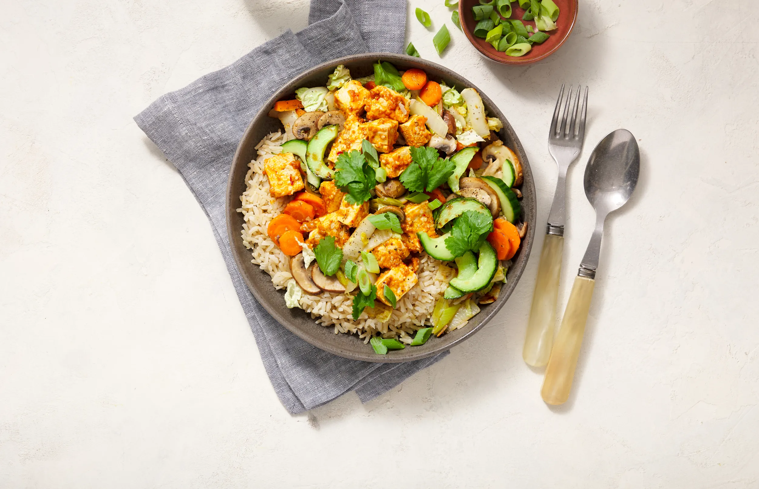 Garneer de tofu met de koriander en serveer met de zilvervliesrijst, komkommer en de groenteroerbak.
