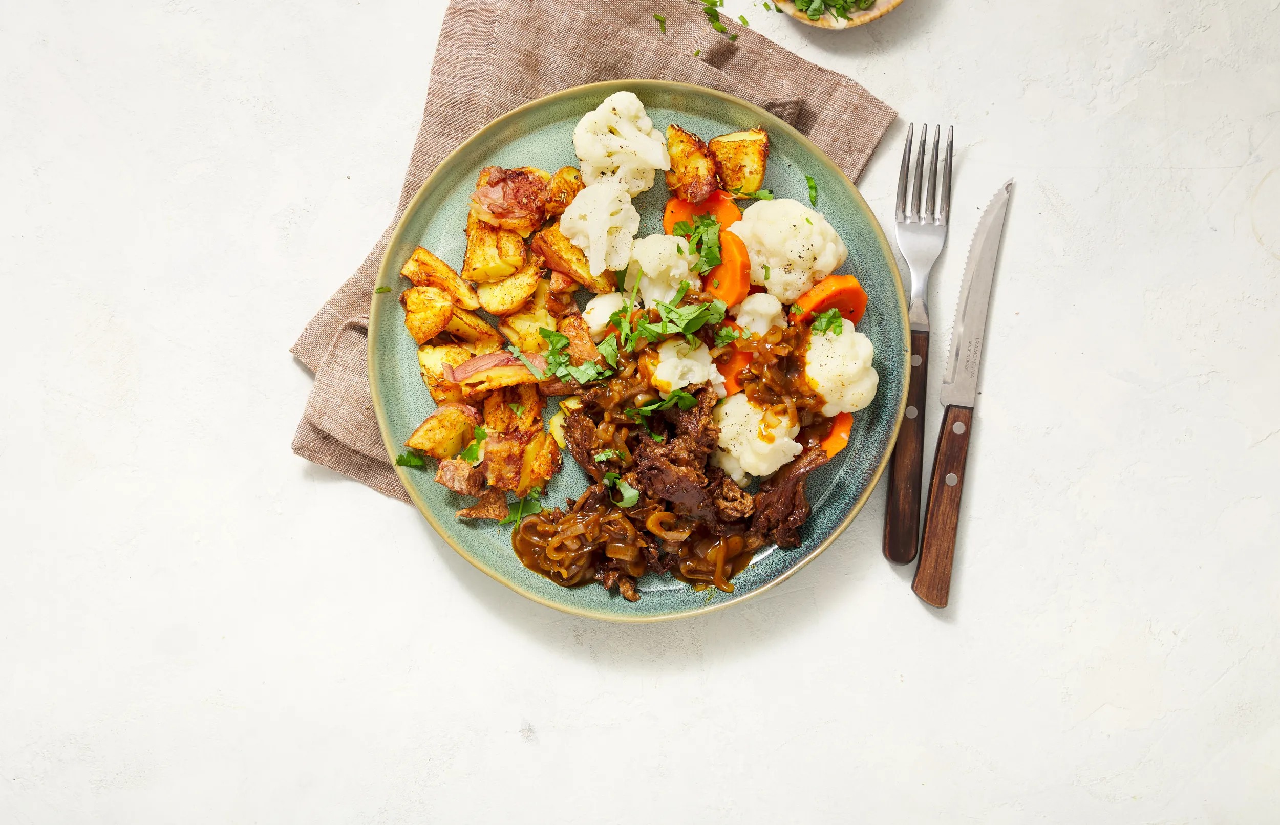 Serveer het PLNT stoofvlees met de smashed krieltjes, groenten en jus. Garneer met ½ bosje peterselie.