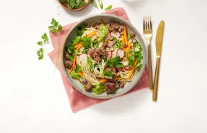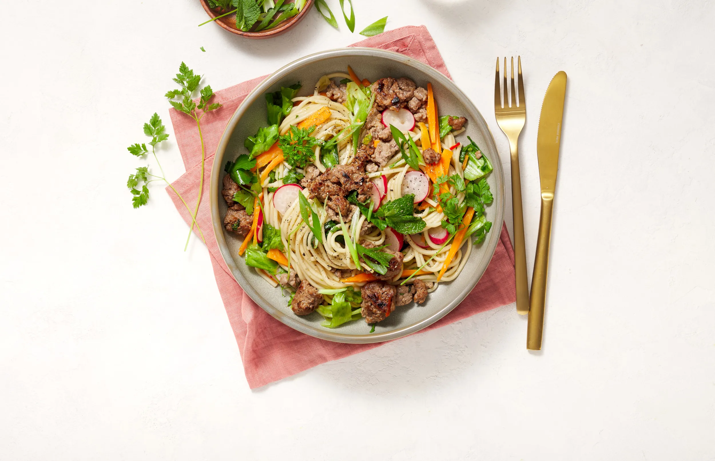 Voeg het gehaktmengsel bij de noedels, samen met de radijs (inclusief azijn). Garneer evt. met de lente-ui-ringetjes.