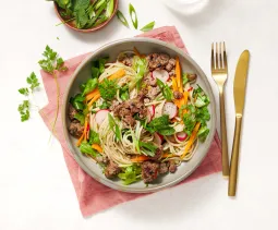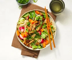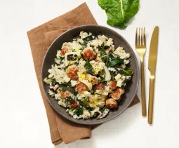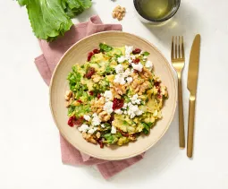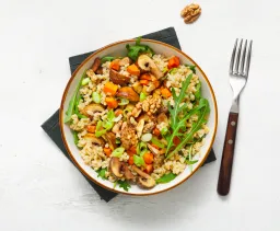 Schep 35 g rucola door de parelgort. Serveer met de groenten en garneer met de walnoten en de rest van de kaas.