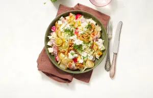 Meng de afgekoelde aardappeltjes door de dressing. Check goed op peper en zout.