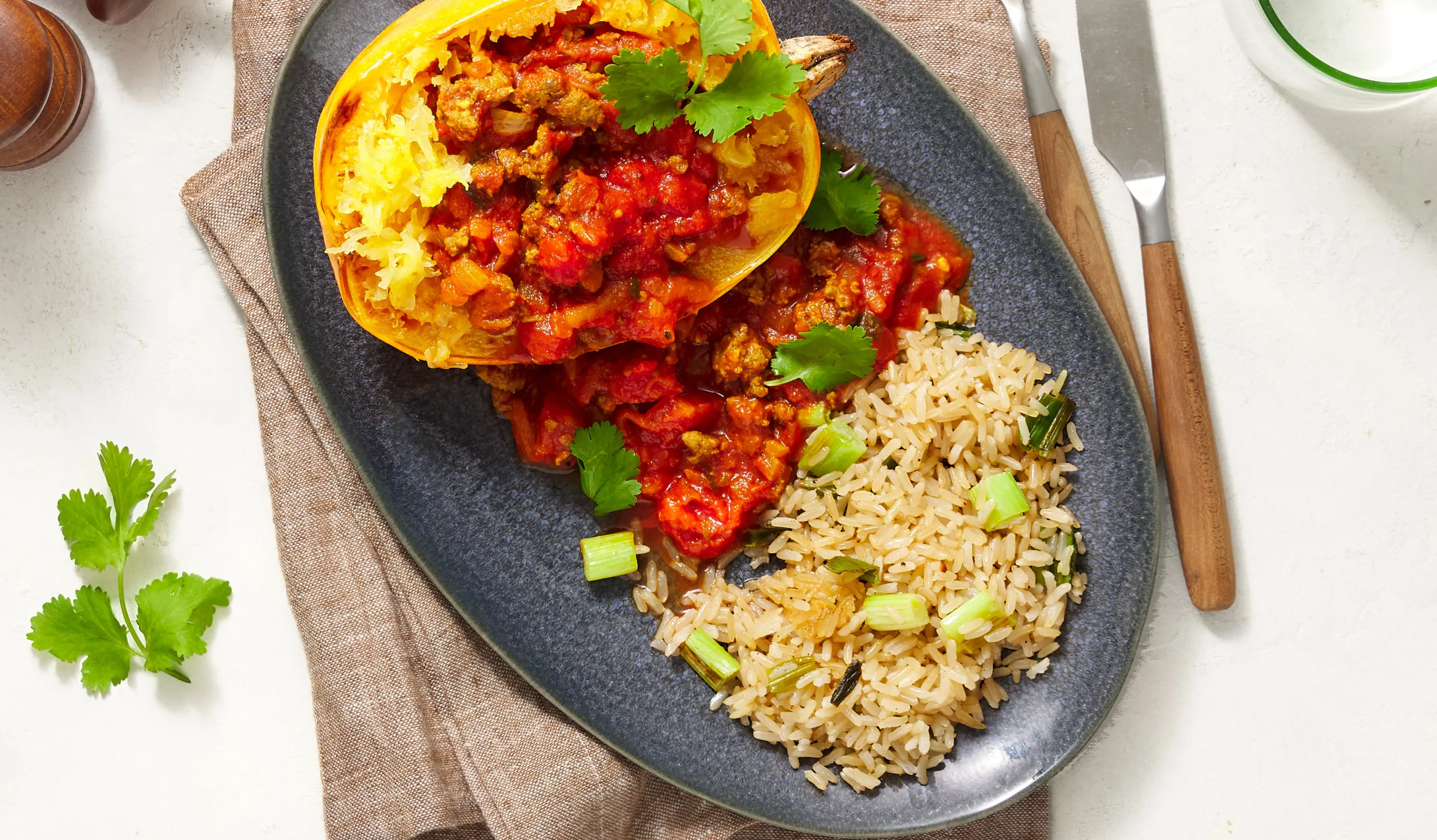 Proef de saus af op peper en zout. Geef iedereen een halve pompoen op het bord. Laat ze met een vork de slierten voorzichtig lostrekken en schep daarover heen de saus. Garneer met de rest van de koriander en serveer met de rijst.