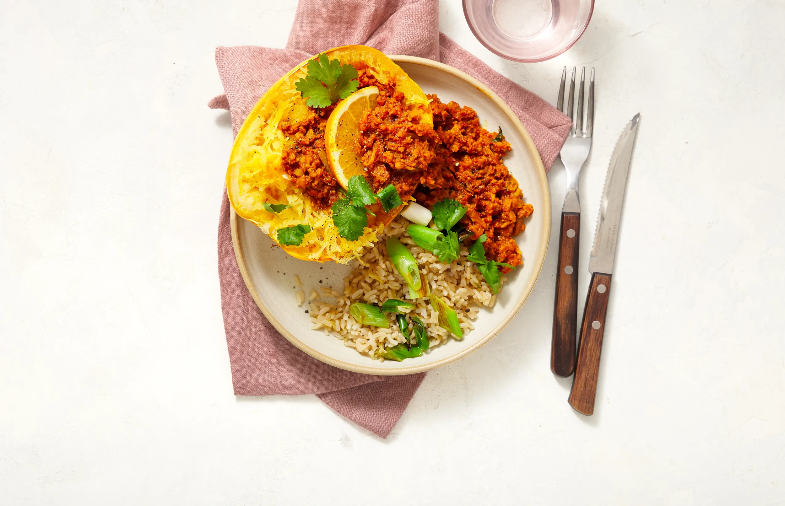 Proef de saus af op peper en zout. Geef iedereen een halve pompoen op het bord. Laat ze met een vork de slierten voorzichtig lostrekken en schep daarover heen de saus. Garneer met de rest van de koriander en serveer met de rijst.