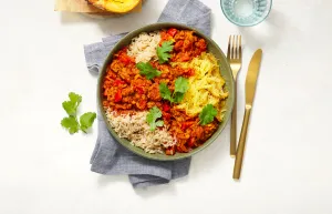 Kruidige Oosterse tomatensaus met spaghettipompoen, rijst en koriander