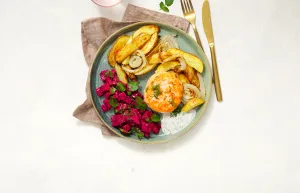 Zalmburger met bietenborani, waterkers, gebakken aardappel en venkel
