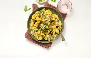 Serveer de pasta met de spruitjes. Rasp naar smaak de kaas (met fijne rasp) erover. Garneer met de crunch.