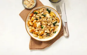 Rooster intussen 30 g amandelschaafsel in een (grote) droge koekenpan – je gebruikt deze pan straks ook voor de gnocchi. Let op dat het niet aanbrandt! Leg op een bordje om af te koelen.
