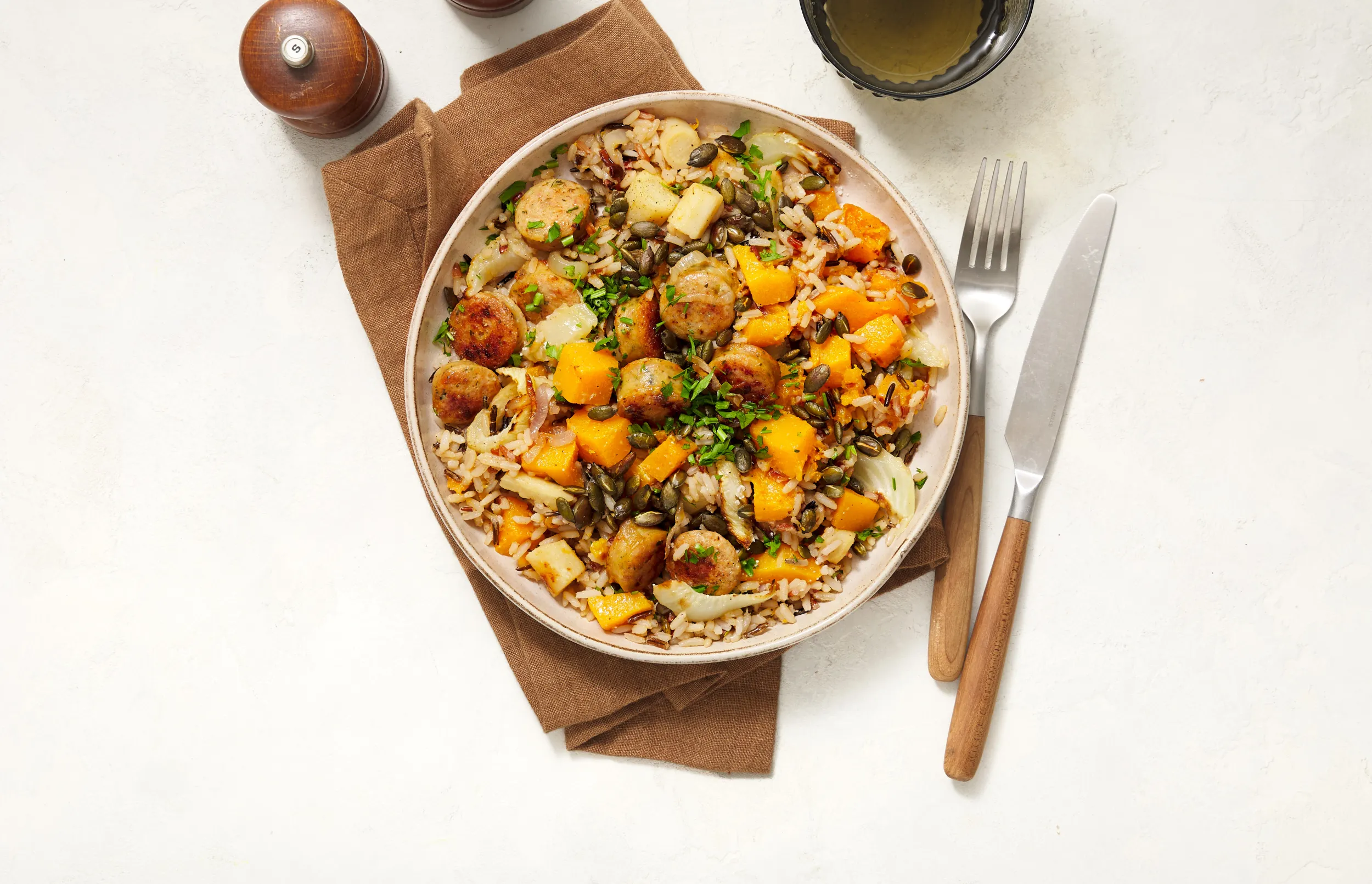 Kipworstjes met gemengde rijst, najaarsgroenten, vinaigrette en pompoenpitten