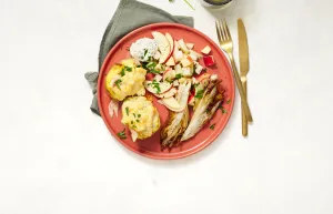 Maak intussen de koolrabi-salade. Maak in een slakom een vinaigrette van 1 el olijfolie extra vierge, ½ el (appel)azijn, 1 tl mosterd, peper en zout. Schil 200 g koolrabi grondig (met name de onderkant). Snij de koolrabi in kleine blokjes van 1 cm. Snij ½ appel (incl. schil) in dunne plakjes. Meng beide door de vinaigrette.