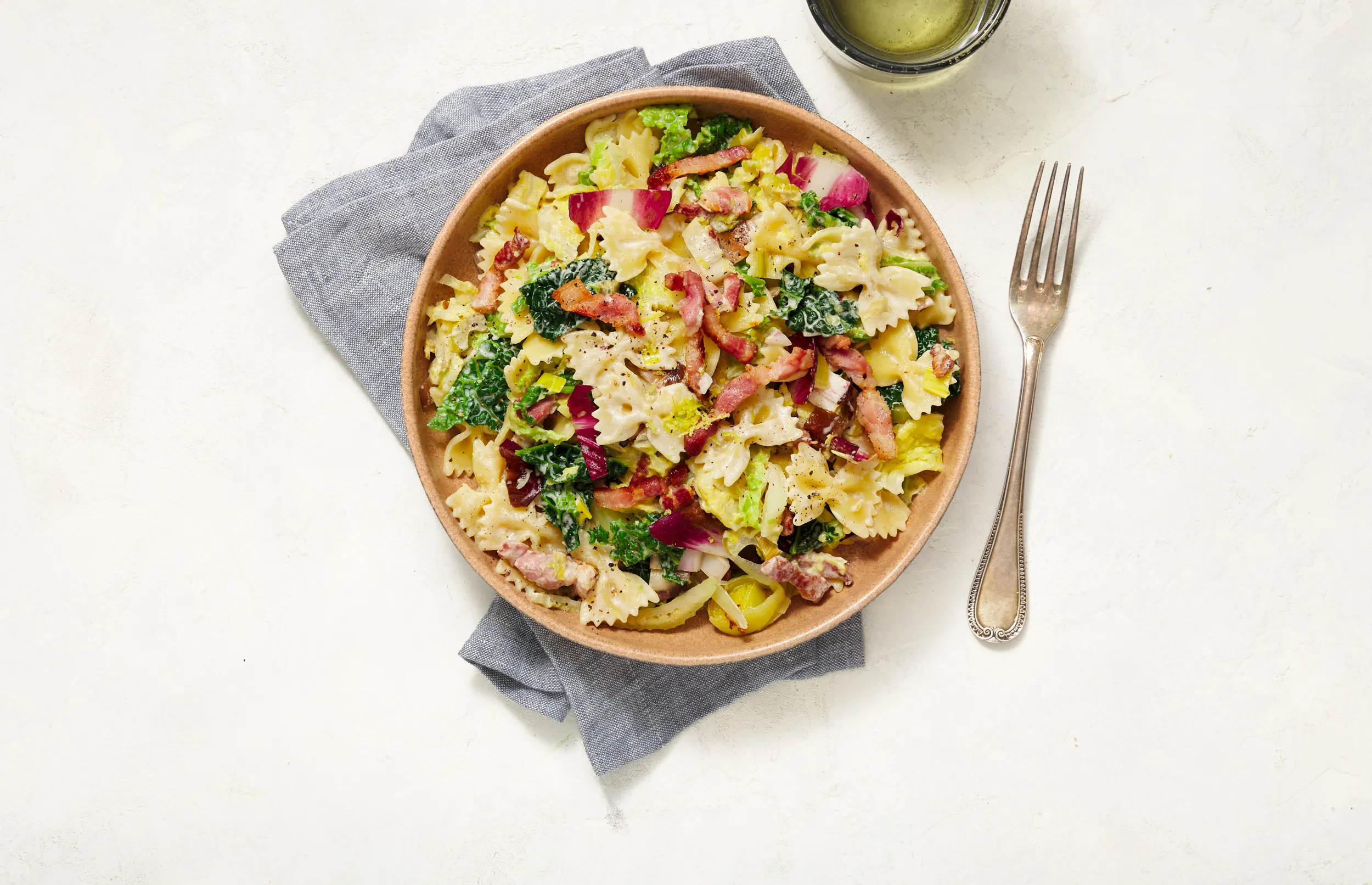 Roer de pasta met groene kool erdoor. Schep vlak voor het aan tafel gaan (als vuur al uit is) de roodlofringen erdoor voor een fris knappertje.