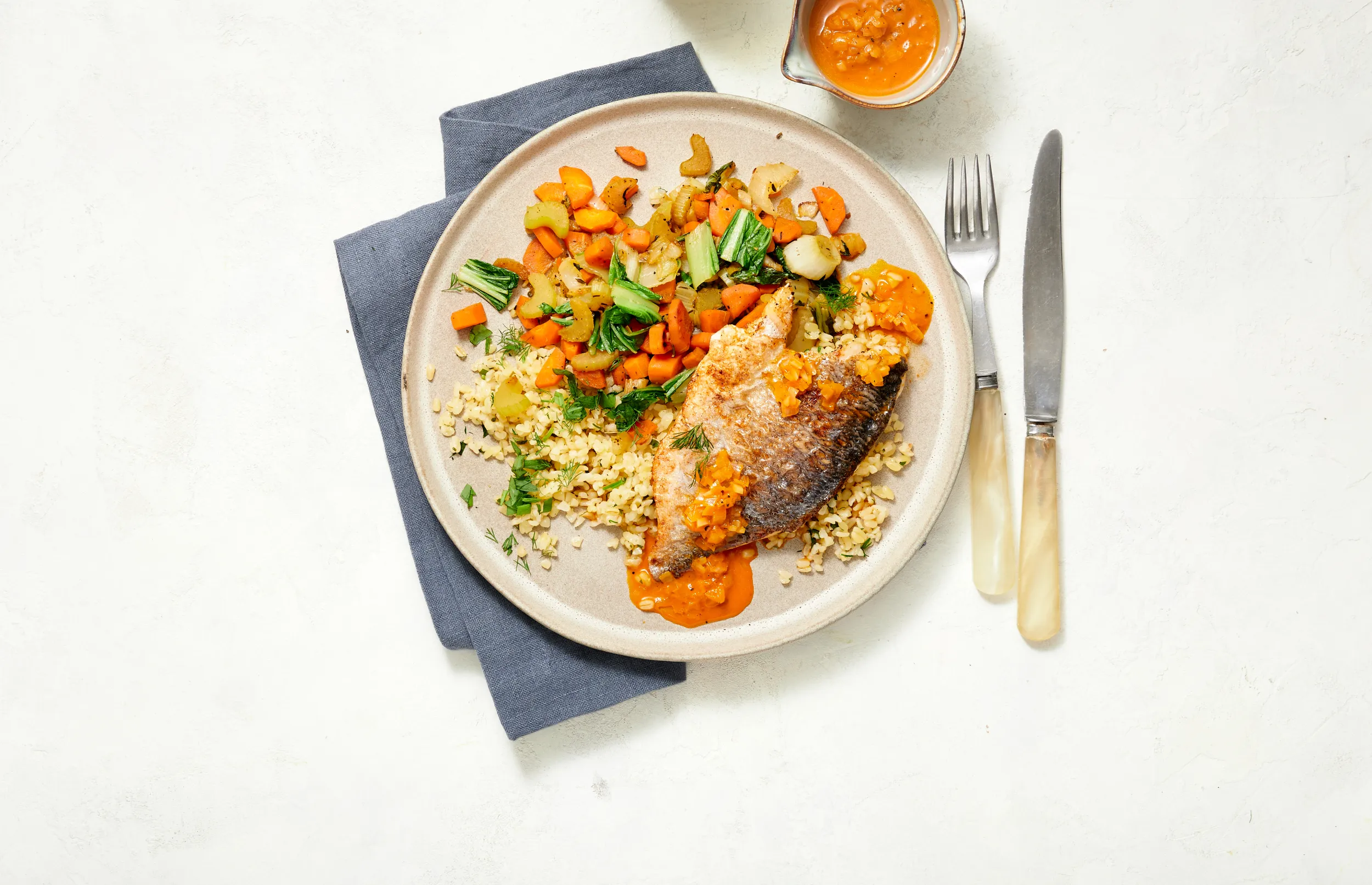 Serveer de dorade met de groentenwok, worteljus en bulgur.