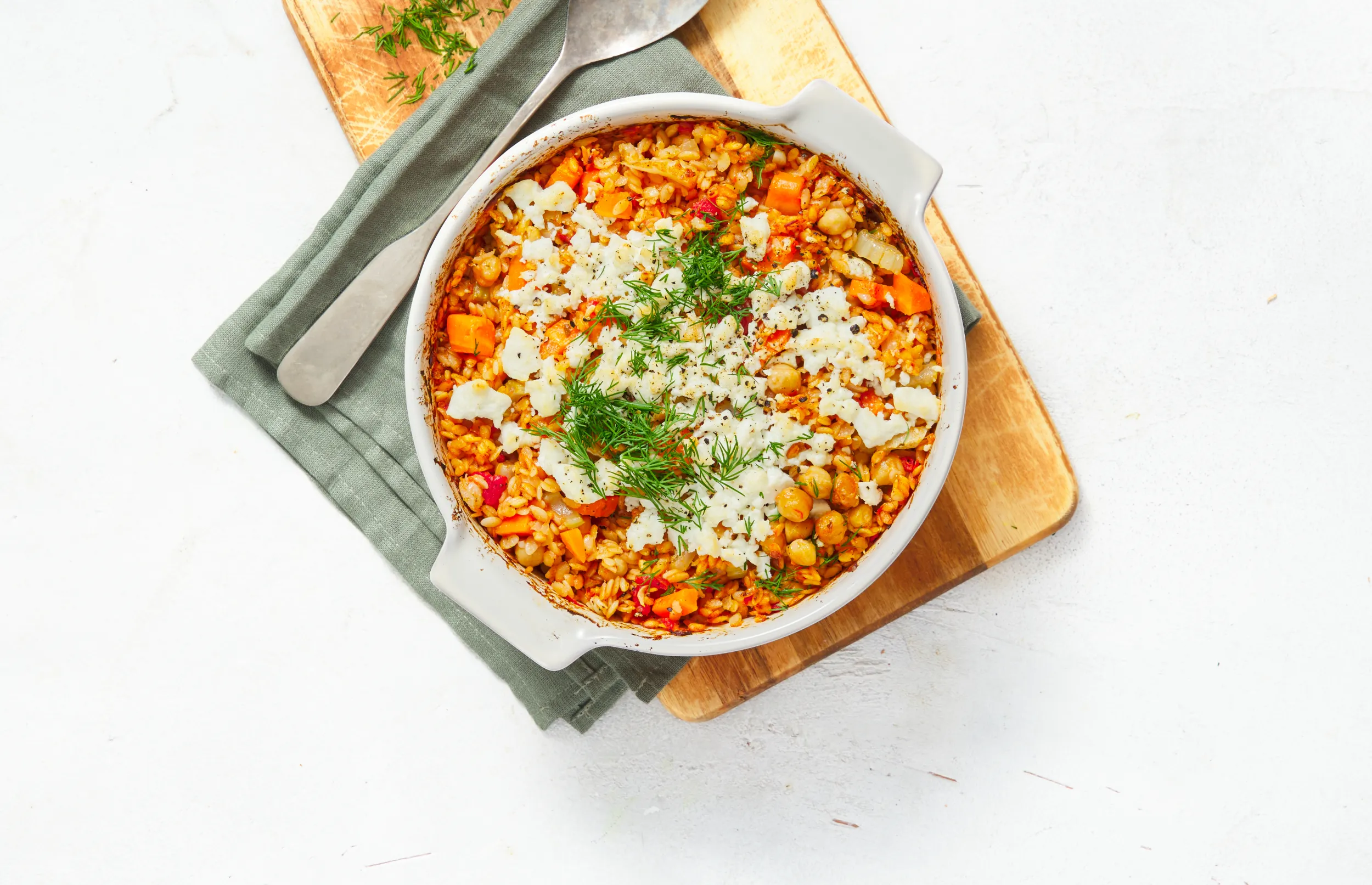 Verdeel de orzo in een ovenschaal en bak ca. 15 minuten in de oven. Verdeel na 10 minuten de feta over de orzo, met een flinke scheut olijfolie en bak