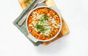Giet 1 pakje kikkererwten af. Voeg toe, samen met ¾ blikje tomatenstukjes, 200 g orzo en 250 ml kokende water. Verkruimel ½ blokje groentebouillon erover en breng op smaak met wat peper.