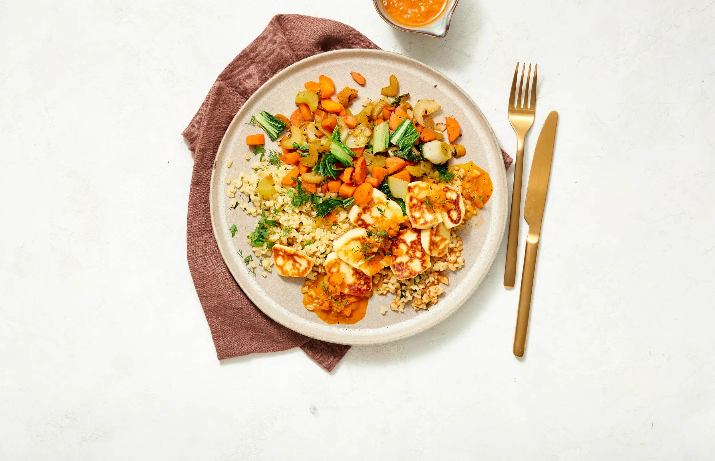 Serveer de grillkaas met de groentenwok, worteljus en bulgur.