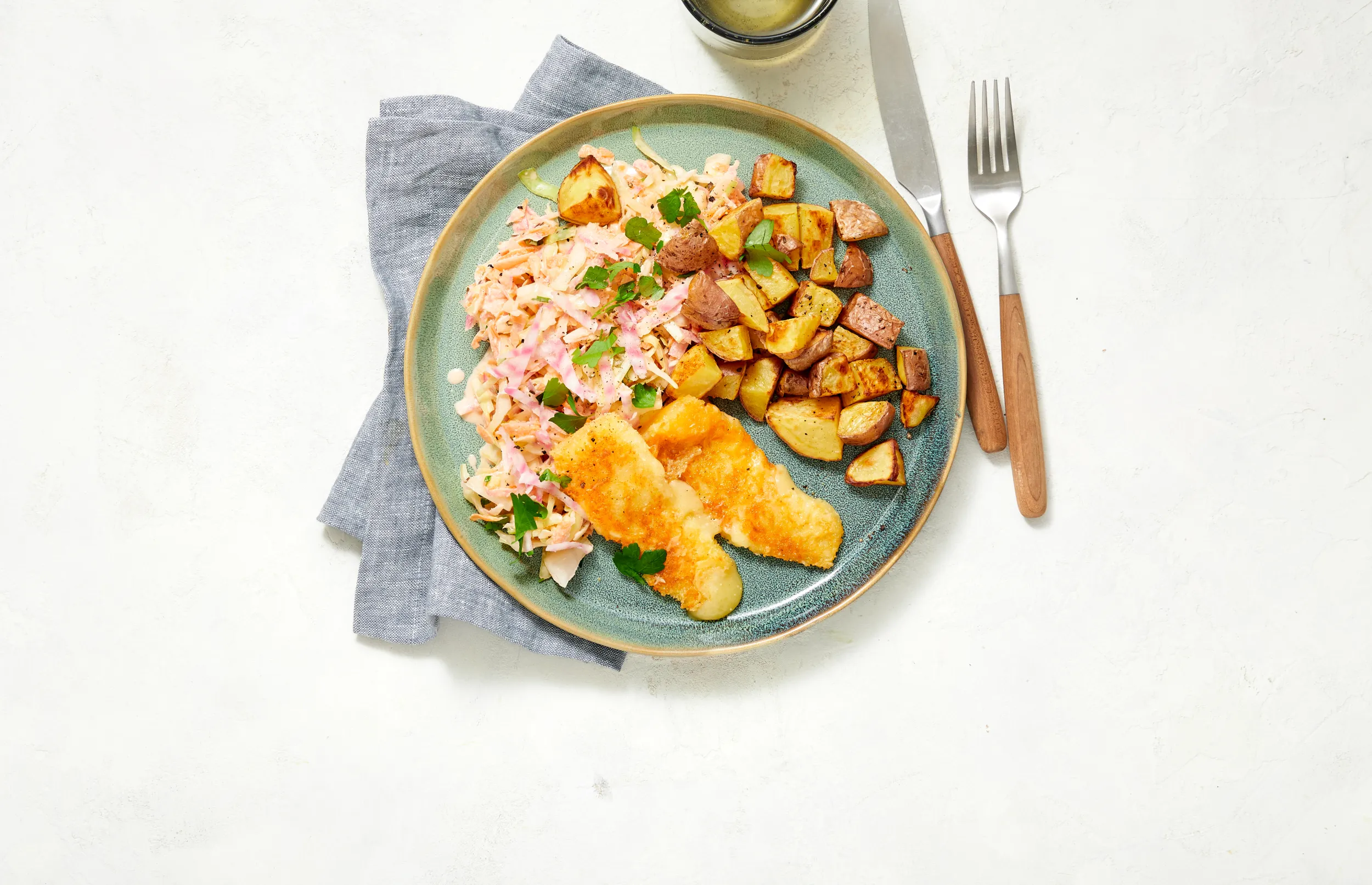 Serveer de coleslaw met de kaasschnitzel en gebakken aardappeltjes met wat mayonaise.