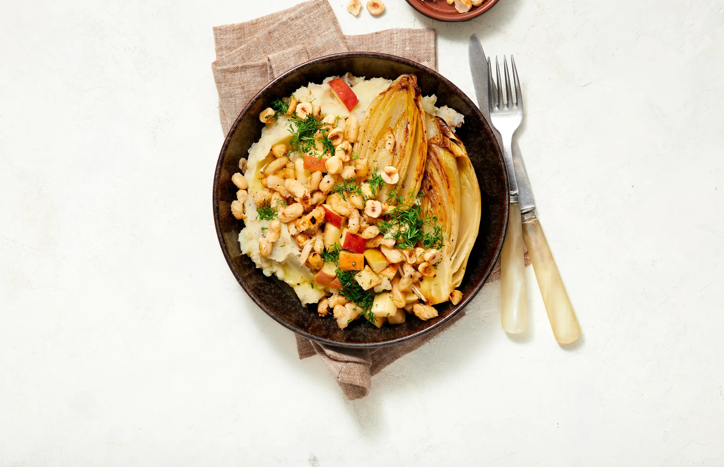 Serveer de puree met de gebakken witlof. Bestrooi met de blokjes appel, krokante boontjes, hazelnoten en dille. Besprenkel met de vinaigrette.