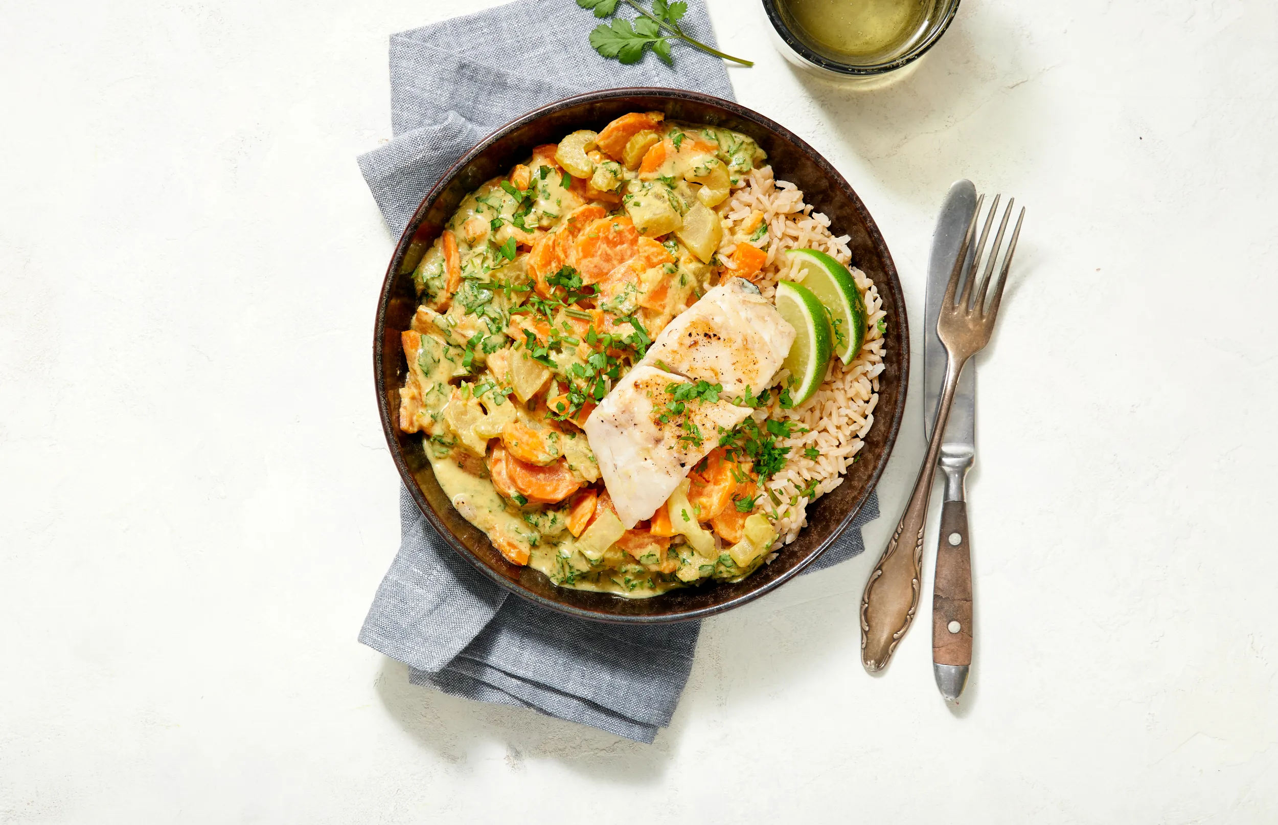 Serveer de curry met de vis en de rijst. Laat ieder er limoensap naar smaak over knijpen.