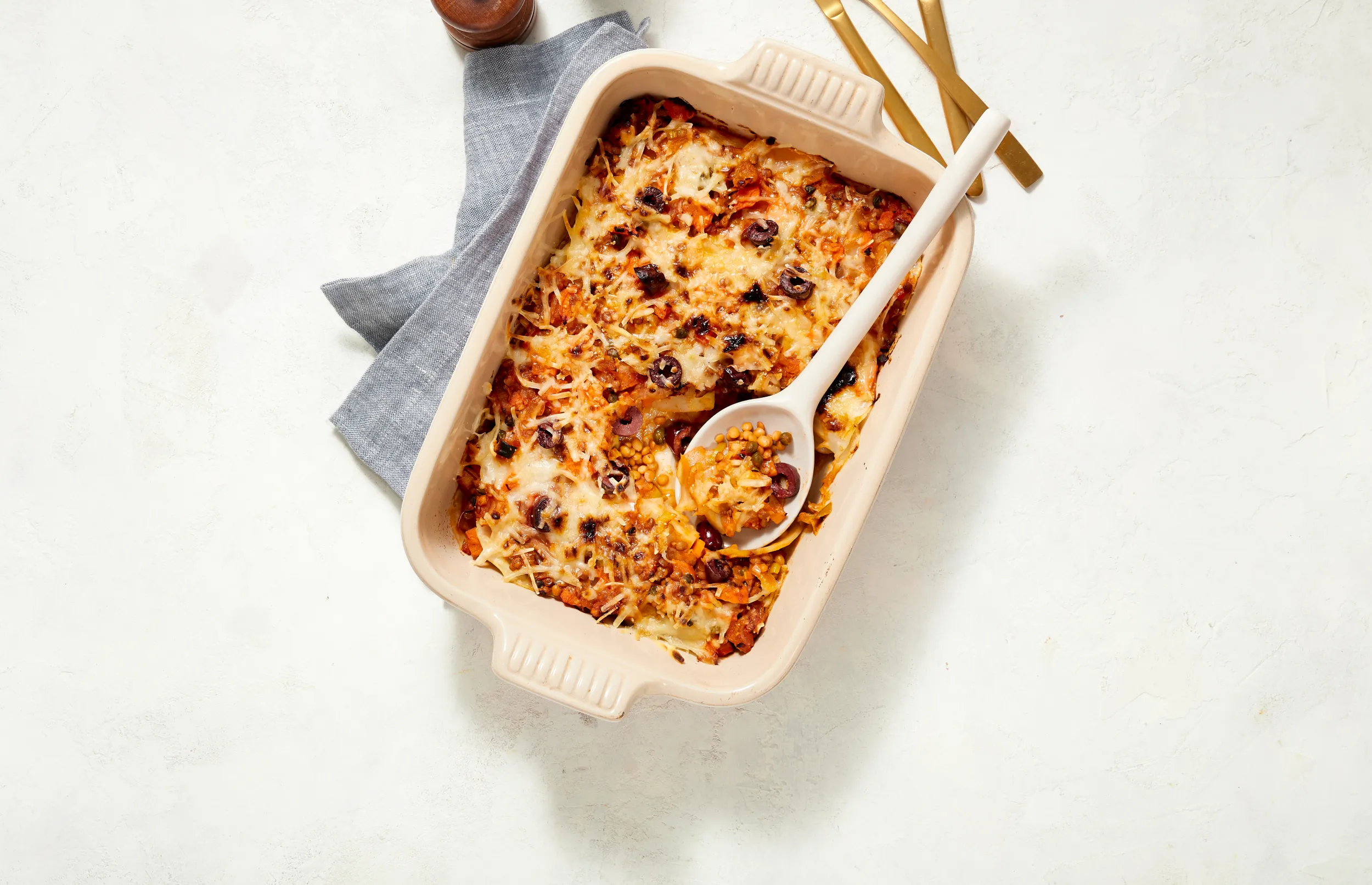 Vet een ovenschaal in en maak een lasagne van 2 of 3 lagen. Verdeel plakken knolselderij op de bodem, schep wat van het groentemengsel erover. Doe dit nog één of twee keer en strooi als laatst 75 g vegan geraspte kaas erover. Schuif ca.10 minuten in de oven totdat er een mooi bruin korstje op zit (of zet even de gril aan).