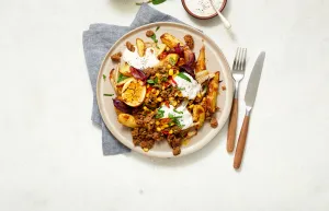 Was 400 g aardappelen en snij in wedges. Schil 200 g wortelpeterselie en snij in Vlaams frietformaat. Verwijder het uiteinde en loof van ½ stuk venkel en pel 1 stuks rode ui. Snij beide in grove parten.