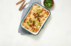 Roer 100 ml sojacuisine en de helft (!) van de strooikaas door de witlof en aardappels. Breng op smaak met peper en zout.