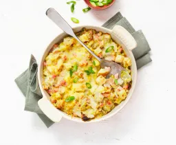 Doe het geheel in een ingevette ovenschaal, strooi de rest van de kaas en 40 g walnoten eroverheen. Zet ca. 10 minuten in de oven zodat er een korstje op komt en de walnoten wat gekleurd zijn. Zet evt. nog even de grill erbij aan (blijf erbij!).