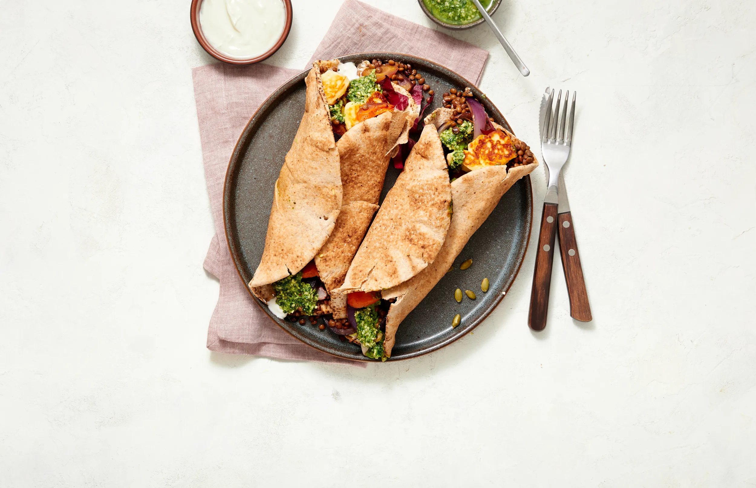 Besmeer de platbroden met 100 g yoghurt. Schep de ui, wortel, linzen en roodlof erop en maak af met de grillkaas en 1 bakje pesto.