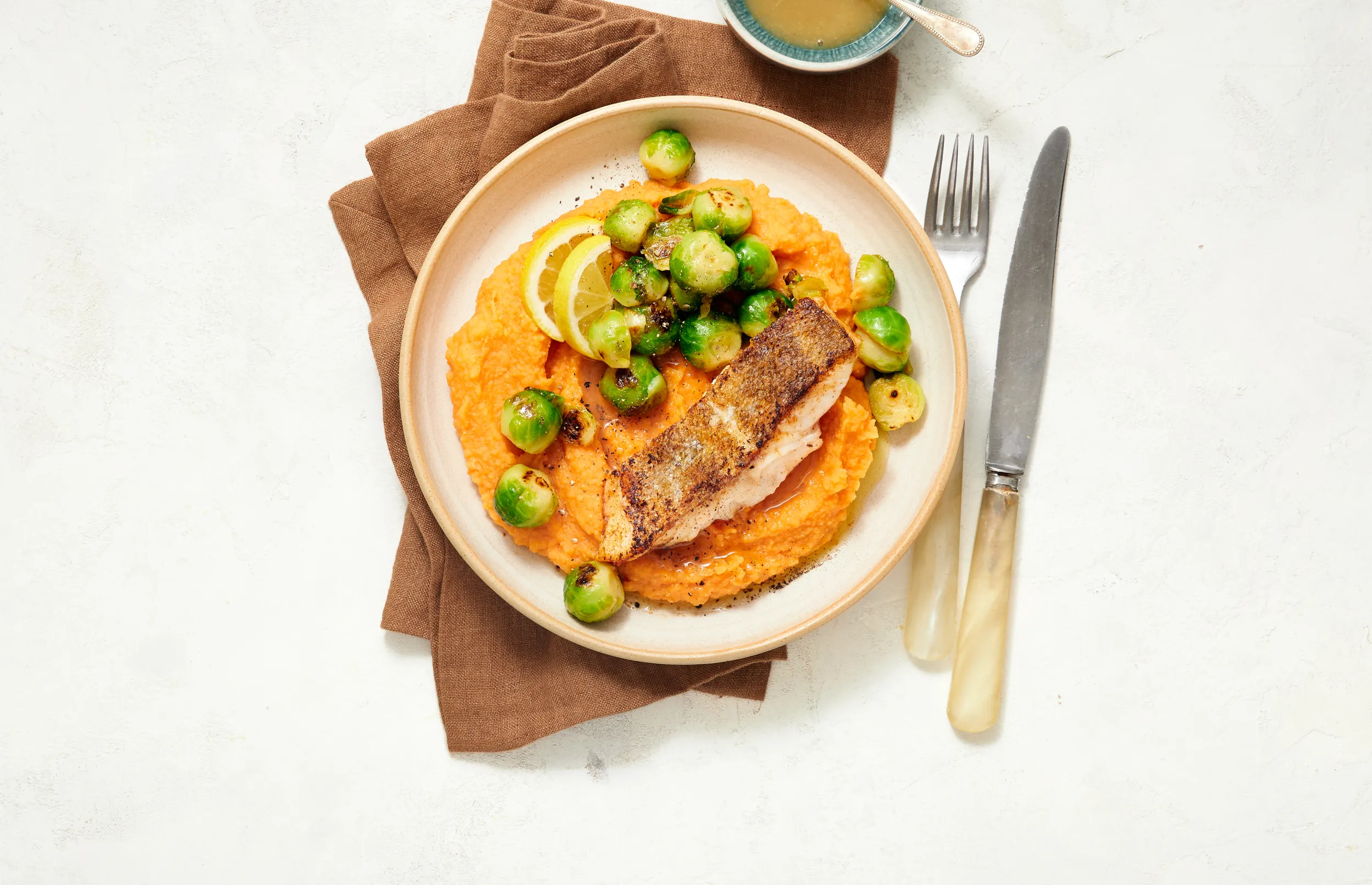 Serveer de skrei met de linzen-wortelpuree, spruitjes en een extra limoensambal naar smaak.