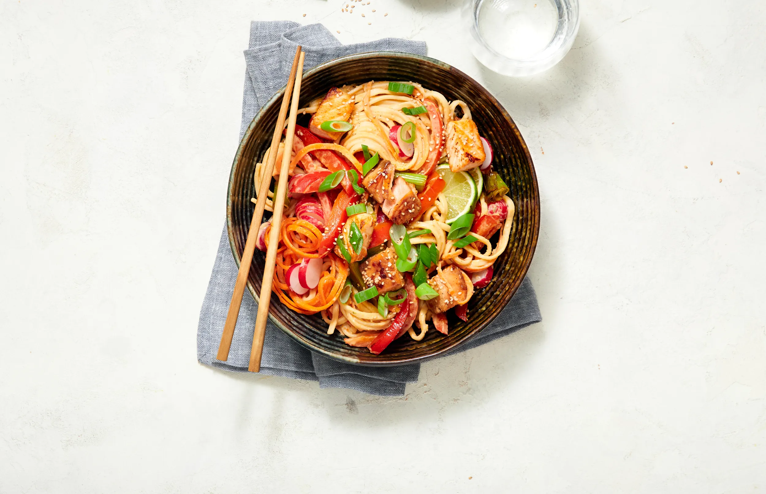 Serveer de lauwwarme noedelsalade met de zalmstukjes en bestrooi met de ringetjes lente-ui en ¾ zakje sesamzaad.