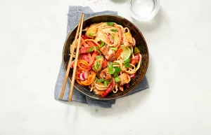 Verwarm olie in een koekenpan of wok. Snij 1 stuks paprika in reepjes, bak even aan. Snij ½ stuk groene peper in ringetjes (verwijder eventueel zaadlijsten), bak mee. Snij het witte en lichtgroene deel van 1 stuk lente-ui in stukken van 2 cm (bewaar het donkergroen ter garnering). Bak nog ca. 5 minuten mee. Breng op smaak met peper en zout.