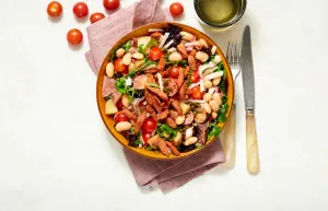 Meng vlak voor serveren de sla door de salade. Verdeel de plantaardige spekjes erover en serveer.