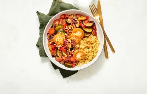 Garneer de ratatouille met de geitenkaas en de pijnboompitjes. Serveer met de bulgur.