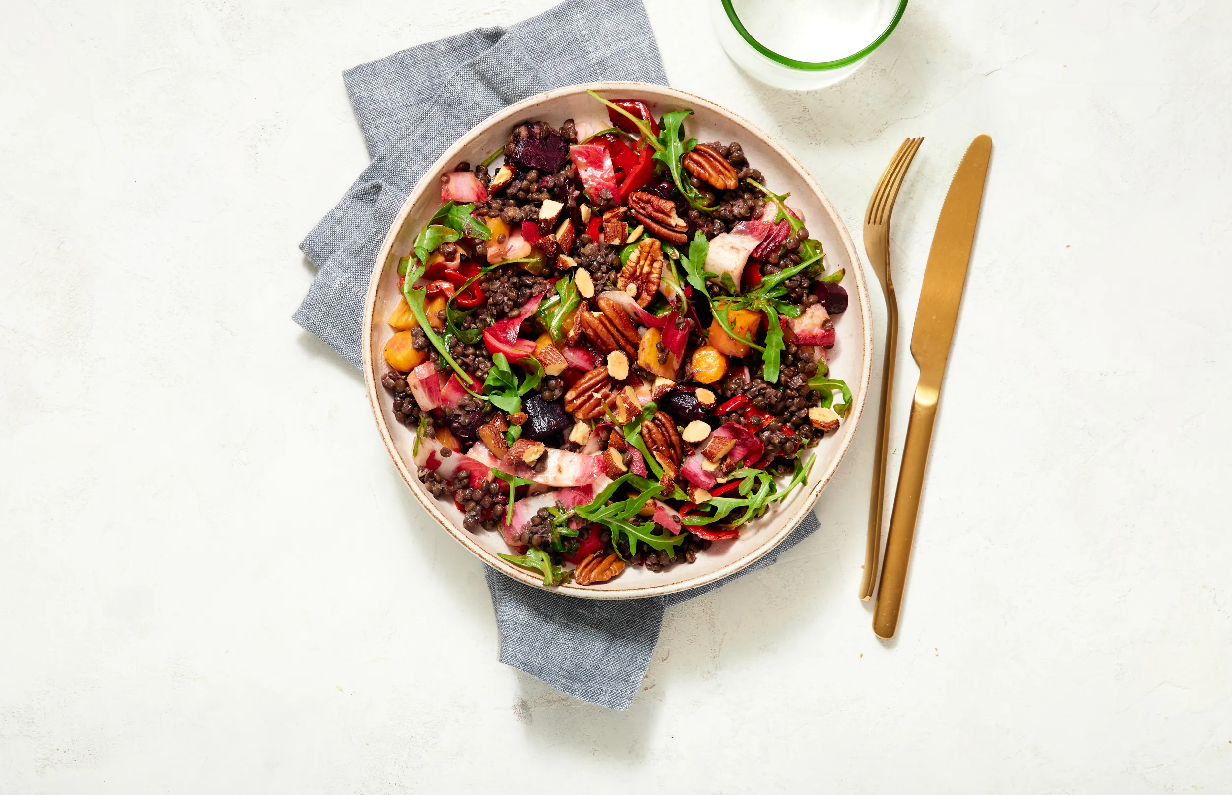 Meng 300 g linzen, groenten uit de oven, radijs, roodlof en rucola door de vinaigrette. Serveer met de pecannoten en amandelen.