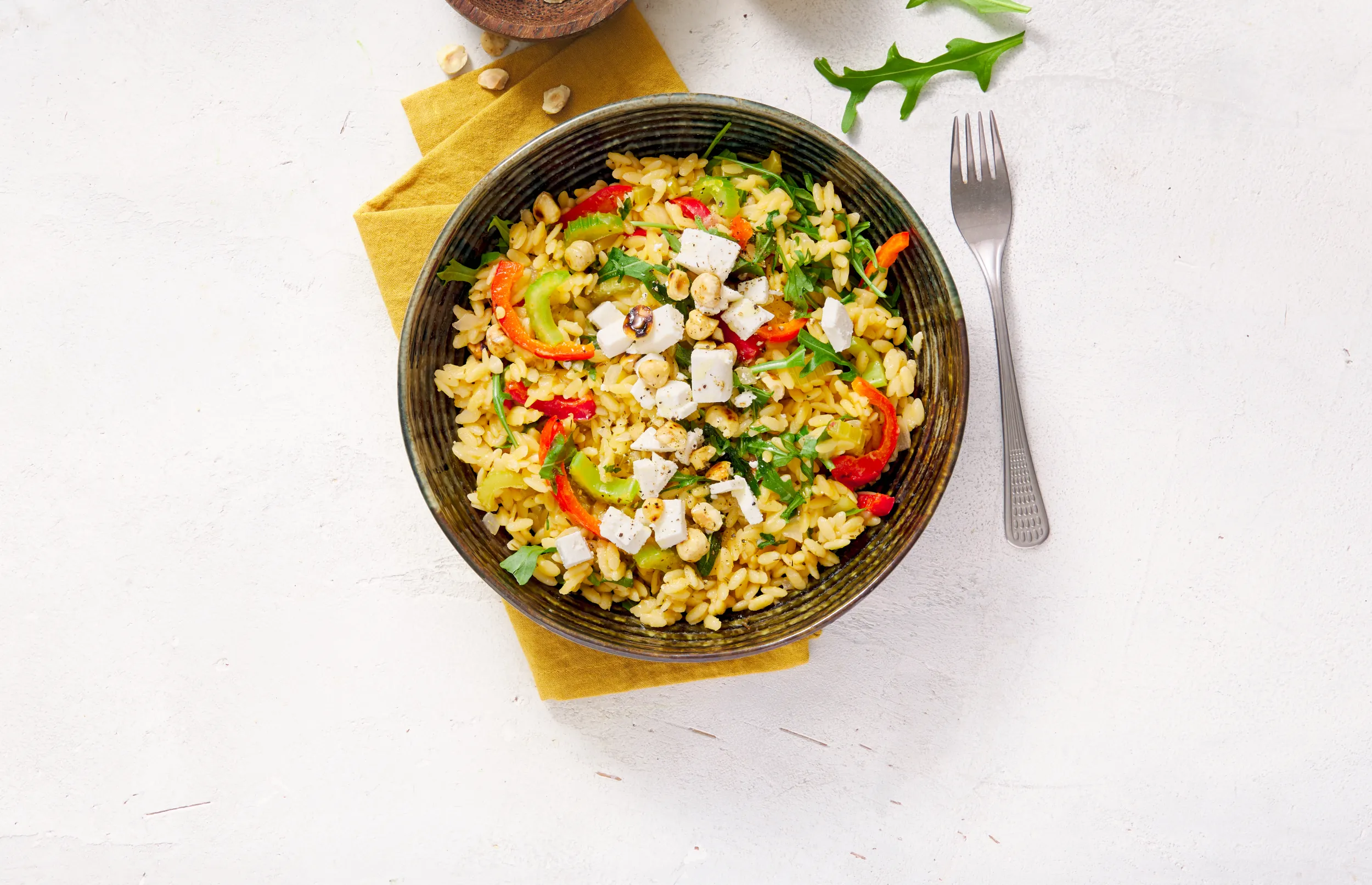 Bak 40 g hazelnoten in een droge koekenpan tot ze wat kleuren. Leg op een plank en hak of plet grof. Snij ½ pakje Greek White in stukjes. Smelt een deel daarvan door de orzo en bewaar de rest voor garnering.