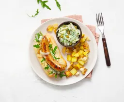 Maak het sausje. Hak 1½ el peterselie en 1½ el bieslook fijn. Meng met 3 el yoghurt, 2 el mayonaise en 1 tl mosterd. Breng op smaak met peper, zout en een kneepje citroensap.