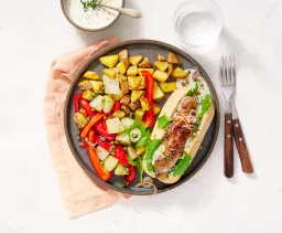 Beleg de broodjes met wat blaadjes raapsteel, saus, sjalot en de seitan kebab. Serveer de groenten erbij en de overgebleven saus bij de aardappels.