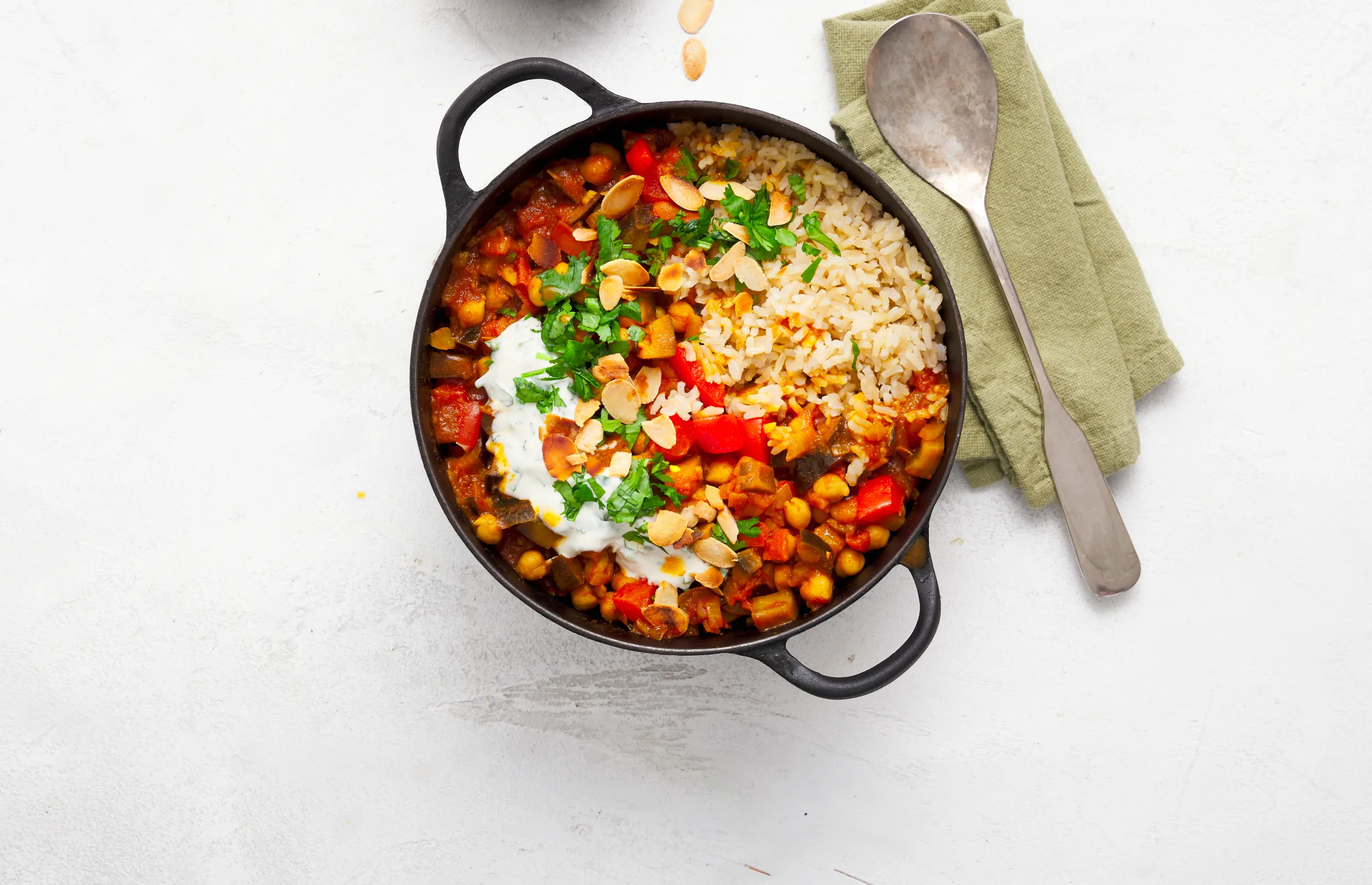 Garneer de stoof met het amandelschaafsel en rest van de koriander. Serveer met de rijst en vegan yoghurt.