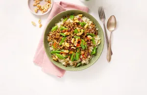 Indonesisch PLNT gehackt met snijbonen, aromatische rijst en zoetzure komkommer