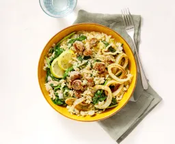 Verhit olie in een andere wok of koekenpan. Snipper 1 stuks ui en fruit zachtjes. Hak 2 teentjes knoflook fijn en snij 150 g kastanjechampignons in plakjes. Voeg de champignons, 1½ tl gedroogde oregano en de knoflook toe en bak een paar minuten mee. Voeg 1 pakje linzen toe en laat afgedekt opwarmen. Breng op smaak met een mespuntje kaneel, ¼ tl suiker en peper.