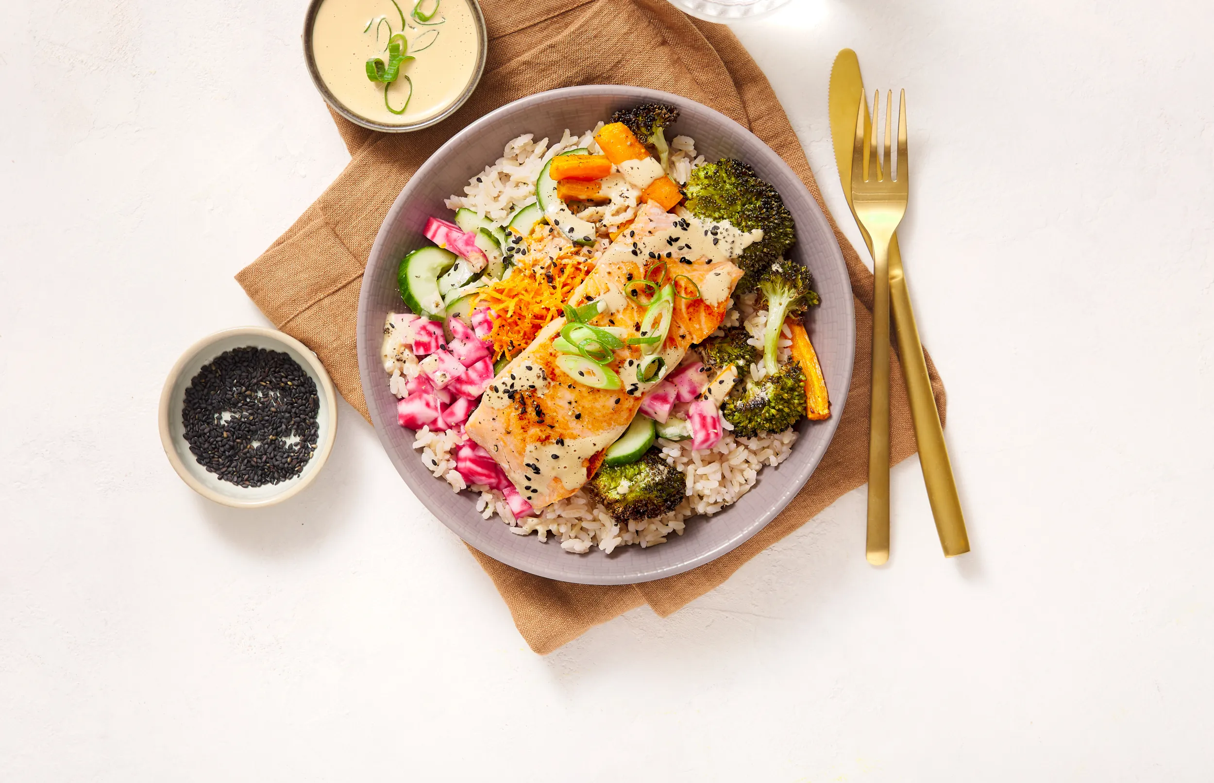 Maak voor iedereen een bowl met de rijst, wortel, bloemkool, biet, komkommer en zalm. Serveer met de sojadressing, sesamzaadjes en lente-ui.