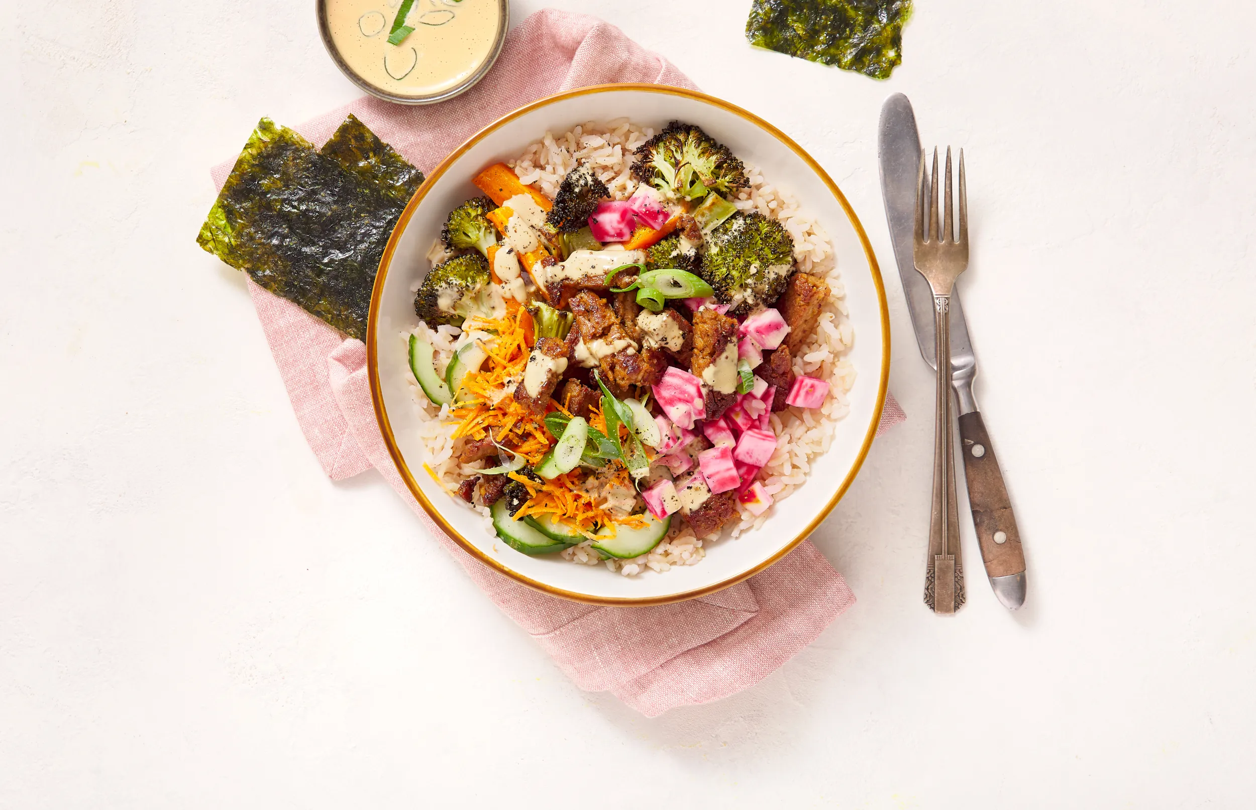 Maak voor iedereen een bowl met de rijst, wortel, bloemkool, biet, komkommer en PLNT stukjes. Serveer met de sojadressing, nori en lente-ui.