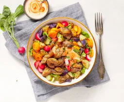 Maak per persoon een bowl van de zoete aardappel, aardappeltjes, wortel, ingelegde radijs, little gem en soja chunks. Serveer met ¾ bakje sriracha yoghurt en garneer met de peterselie.