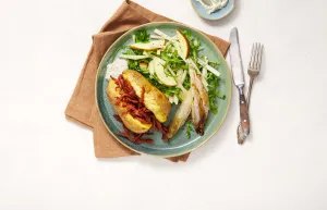 Vul de gepofte aardappel met de vegan spekjes en het sausje. Serveer met de witlof en de salade.